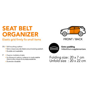 Organizer da agganciare alla cintura di sicurezza. La griglia elastica blocca in modo fermo i piccoli oggetti. Imbottitura supplementare. Cuscino morbido al tatto. La chiusura in velcro si attacca in modo stabile intorno alla cintura di sicurezza esistente. Durevole e lavabile