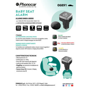 Allarme bimbo a bordo per auto con presa accendisigari senza sottochiave. Si può integrare al seggiolino già presente in auto. Oltre a questa funzione il Baby Alarm avvertirà il conducente se il bambino non è correttamente seduto, si muove o lascia il seggiolino. Plug&Play: non necessita di installazione da parte di un tecnico. Sensore e display comunicano senza fili. Alimentazione DC 12V. Limiti di peso: 2,5/36Kg. Presa USB 1A per ricaricare altri dispositivi. Conferme alle normative 2014/53/EU