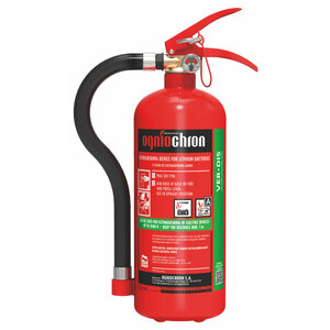 Estintore per batterie al litio. Progettato per proteggere i dispositivi con batterie agli ioni di litio come: laptop, tablet, powerbank, ecc.. Un innovativo agente estinguente a base di dispersione di vermiculite, raffredda rapidamente la batteria ed estingue le fiamme. Il guscio ermetico blocca l'ossigeno e impedisce la propagazione del fuoco. Caratteristiche di base: funzionamento facile ed ergonomico, spegnimento rapido ed efficace, manutenzione e assistenza economici, la valvola di intercettazione dietro l'indicatore di pressione facilita il controllo dell'estintore, la struttura della valvola consente l'interruzione temporanea dell'estinzione, possibilità di rabbocco multiplo, bombola dell'estintore rivestita con vernice poliestere, resistente ai raggi UV, interno della bombola protetto con strato anticorrosivo. Prodotto secondo i requisiti del mercato nazionale e dell'UE sulla base del sistema certificato ISO 9001. Soddisfa i requisiti EN3 e PED 2014/68/UE
