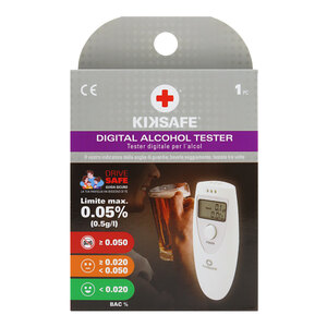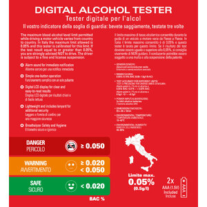 Etilometro digitale. Garantisci la sicurezza stradale verificando la tua sobrietà prima di guidare. Allarme sonoro per una notifica immediata. Funzionamento semplice con un solo pulsante. Display LCD digitale per risultati chiari e di facile lettura. Leggero e fornito di cordino per una maggiore sicurezza. Etilometro sicuro e igienico. Il limite massimo del tasso alcolemico ammesso durante la guida di un veicolo a motore varia da nazione a nazione. In Italia il limite massimo ammesso è dello 0,05% e questo tester è tarato per tale limite. Se il risultato del test corrisponde al Led Rosso (pari o superiore allo 0,05%) si consiglia vivamente di NON mettersi alla guida. Il guidatore è soggetto ad ammenda e sospensione della patente. Etilometro a semiconduttore avanzato. Range: 0,00% - 0,19% BAC (0,00 - 1,9g/l BrAC)