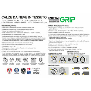 Calze da neve in tessuto. Struttura multi assorbente, non crea vibrazioni durante la guida. Il battistrada multistrato offre una durata e una trazione estrema. Nessun danno al pneumatico o al cerchio. Facile da installare e veloce da rimuovere. Riutilizzabile e lavabile in lavatrice. Compatibili anche con i dispositivi ESP e ABS. Le calze sono omologate e testate da diversi istituti di ricerca europei di trasporto stradale avendo un'elevata aderenza aggiuntiva durante la guida su strade ghiacciate o innevate. Si consiglia comunque di verificare le leggi stradali del tuo paese prima di installarle. Att.ne: vanno sempre montate nelle ruote dell'asse di trazione indicato nel libretto di "Uso e manutenzione" proprio del veicolo. Verificare che le catene siano compatibili con la misura delle gomme dell'asse di trazione. Fare particolare attenzione nei veicoli a trazione integrale o mista, rispettare sempre quanto previsto dalla casa costruttrice. EN16662-1.ONORM V5121 Reg.Nr.:288-22982