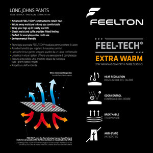 Pantaloni termici intimi. Soluzione caldissima grazie allo strato interno speciale. Il tessuto tecnico a contatto con la pelle veicola l'umidità verso l'esterno del tessuto, disperdendola su un'area maggiore, per diminuire il tempo di asciugatura, senza però disperdere calore. Allo stesso tempo si adatta al corpo e mantiene proprietà isolanti anche in condizioni di sudorazione elevata. Tecnologia avanzata Feel-Tech studiata per mantenere il calore. La tecnologia Feel-Tech in microfibra migliora la sensazione di morbidezza e crea ulteriori sacche d'aria all'interno della fibra, creando così un effetto termico isolante. Assorbe l'umidità per regalarti il massimo comfort. Lascia che le tue gambe vengano avvolte da un calore confortevole. L'elastico in vita e nelle caviglie offrono una maggiore sensazione di comfort. Ideale per i tuoi viaggi in moto, ma anche per altri sport: walking, running o per l'uso in città