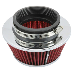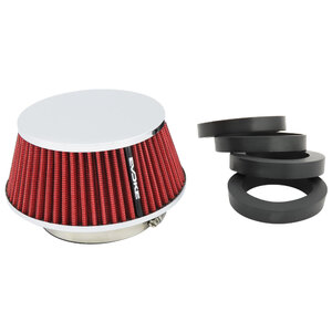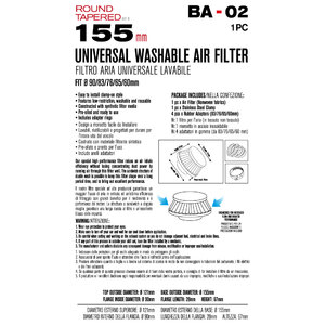 Filtro aria universale lavabile. Fit diam. 90/83/76/65/60mm. Progettato per un flusso maggiore e prestazioni migliori. Diametro esterno superiore: 121mm. Diametro interno della flangia 90mm. Diametro esterno della base: 155mm. Lunghezza della flangia: 28mm. Altezza 67mm Filtro speciale ad alte prestazioni garantisce un maggior flusso di aria in entrata ed un'ottima efficienza di filtraggio con grandi benefici per il rendimento e le performance del motore. La struttura a sandwich a doppia maglia garantisce una lunga durata al filtro e un'eccellente blocco delle impuritá. Design a morsetto facile da ìinstallare. Lavabile, riutilizzabile e progettato per durare per l'intera vita del veicolo. Costruito con materiale filtrante sintetico. Pre-oliato e pronto per l'uso. Include anelli adattatori. La confezione include: 1 filtro per l'aria (in tessuto non tessuto); 1 morsetto in acciaio inossidabile; 4 adattatori in gomma (da 83/76/65/60 mm)