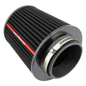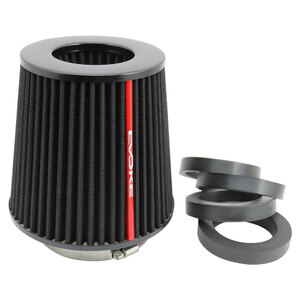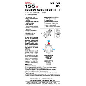 Filtro aria universale lavabile. Fit diam. 90/83/76/65/60mm. Fornisce un flusso d'aria elevato e una filtrazione eccezionale. Diametro esterno superiore: 120mm. Diametro esterno della base: 155mm Diametro interno della flangia: 90mm Lunghezza della flangia: 35mm Altezza: 152mm. Design a morsetto facile da installare. Progettato per aumentare la potenza e l'accelerazione. Progettato con materiale lavabile e riutilizzabile. Pre-oliato e pronto per l'uso. Include anelli adattatori. Filtro speciale ad alte prestazioni garantisce un maggior flusso di aria in entrata ed un'ottima efficienza di filtraggio con grandi benefici per il rendimento e le performance del motore. La struttura a sandwich a doppia maglia garantisce una lunga durata al filtro e un'eccellente blocco delle impuritá. La confezione include: 1 filtro per l'aria (in tessuto non tessuto), 1 morsetto in acciaio inossidabile, 4 adattatori in gomma (da 83/76/65/60 mm)