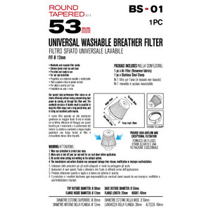 Filtro sfiato motore universale, lavabile. Protegge il motore. Progettato con materiale lavabile e riutilizzabile. Parte superiore e base in acciaio cromato. Pre-oliato e pronto per l'uso. Installabile su auto e moto. Filtro speciale ad alte prestazioni garantisce un maggior flusso di aria in entrata ed un'ottima efficienza di filtraggio con grandi benefici per il rendimento e le performance del motore. La struttura a sandwich a doppia maglia garantisce una lunga durata al filtro e un'eccellente blocco delle impuritá. Diametro esterno superiore: 38mm. Diametro esterno della base: 53mm. Diametro interno della flangia: 12mm Lunghezza della flangia: 20mm. Altezza: 40mm. La confezione include: 1 filtro per l'aria (in tessuto non tessuto); 1 morsetto in acciaio inossidabile