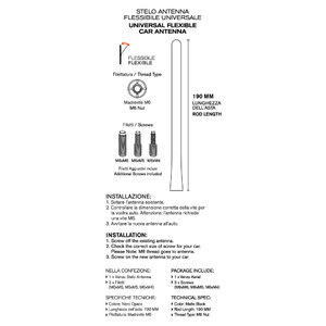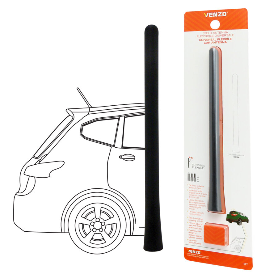 Antenna universale in gomma, flessibile. Resistente al lavaggio dell'auto e a condizioni metereologiche avverse. Montaggio semplice svitando la vecchia antenna e avvitando la nuova asta con una delle tre viti incluse nella confezione. Installabile sulla maggior parte delle auto. Questa antenna non monta su veicoli del Gruppo FCA (Alfa, Fiat, Jeep...) con base antenna rettangolare, su Opel Crossland, Opel Grandland e Peugeot 2008. Misurare il foro della vite sulla base dell'antenna prima di acquistare il prodotto, un lato del diametro della vite è di 6 mm per l'antenna, l'altro lato è per la base dell'antenna
