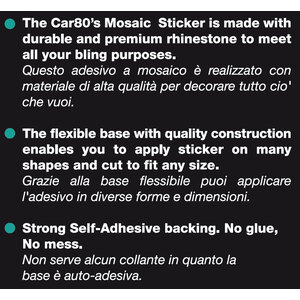 Adesivo mosaico ritagliabile, con base adesiva, si applica facilmente. Leggermente flessibile per adattarsi ad ogni forma. Realizzato con materiale di alta qualità per decorare tutto cio' che vuoi. Grazie alla base flessibile puoi applicare l'adesivo in diverse forme e dimensioni. Non serve alcun collante in quanto la base è auto-adesiva. Progettato per essere applicato su superfici rigide, cruscotti auto, moto, scooter, smartphones, computers, tablets... Designed in USA