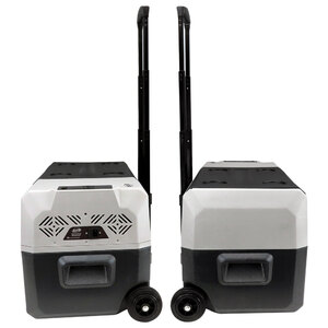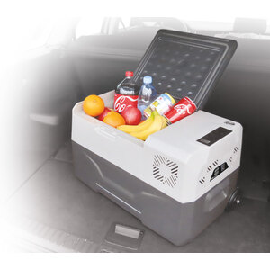 Frigorifero e congelatore portatile, con compressore. Il potente compressore mantiene costante il raffreddamento ed il congelamento. Display a LED per il controllo della temperatura. La porta di ricarica USB permette di mantenere carichi i tuoi dispositivi mobili. Manico telescopico e ruote per un facile trasporto. Caricatore per presa accendisigari incluso DC 12/24V, 3,3m. Caricatore da parete EU AC 100/240V incluso, 1,9m. Raffreddamento (in modalità normale): -20°C - 20°C. App Control. Dimensioni interne: 47x25x28cm Dimensioni esterne: 61x38x37cm Certificato ERP