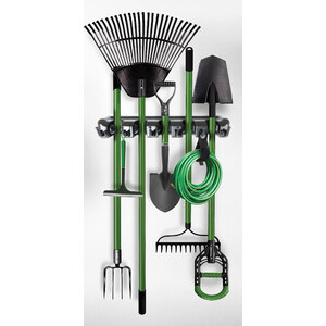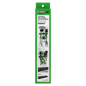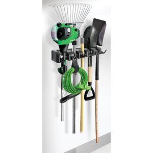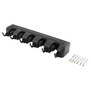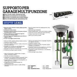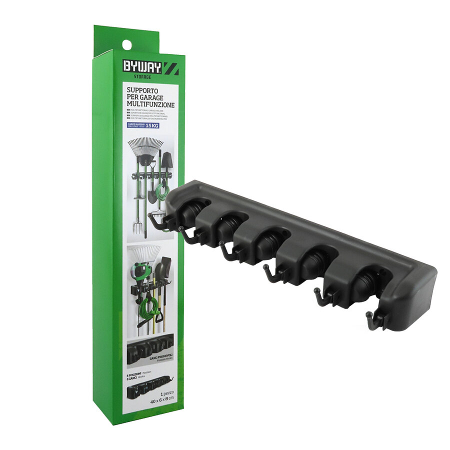 Supporto per garage multifunzione. Carico massimo 15kg. Ganci pieghevoli. 5 posizioni. 6 ganci. Ideale per essere utilizzato in garage, giardino, negozio, cantina, bagno... Installazione facile e veloce. Realizzato in plastica resistente. Può essere utilizzato in ambienti interni o esterni. Dotato di 5 fessure con impugnature in gomma per mantenere saldi gli utensili. Fornito di 6 ganci per impieghi gravosi per offrire maggiore utilizzo. Viti per il montaggio a parete incluse. La confezione include: 1pz supporto, 6pz viti, 6pz tasselli da muro