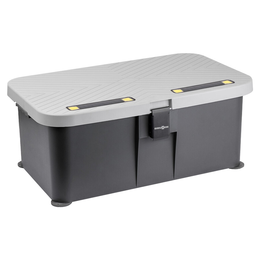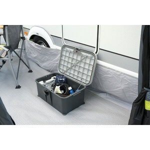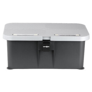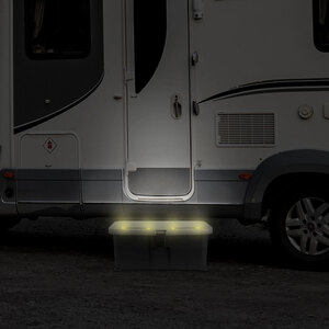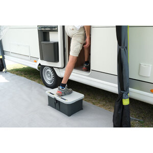 Gradino per veicoli ricreazionali di nuova concezione con spazio interno impermeabile per accessori utili, come attrezzi, liquidi sanitari, prolunghe, ecc. Il coperchio chiudibile mediante gancio a leva è dotato di un profilo antiscivolo ed è dotato anche di una luce solare di sicurezza integrata. Costruzione in plastica di alta qualità, molto stabile, con piedini rotanti per la regolazione del livellamento. Peso prodotto 3,92kg. Carico massimo supportato 150kg
