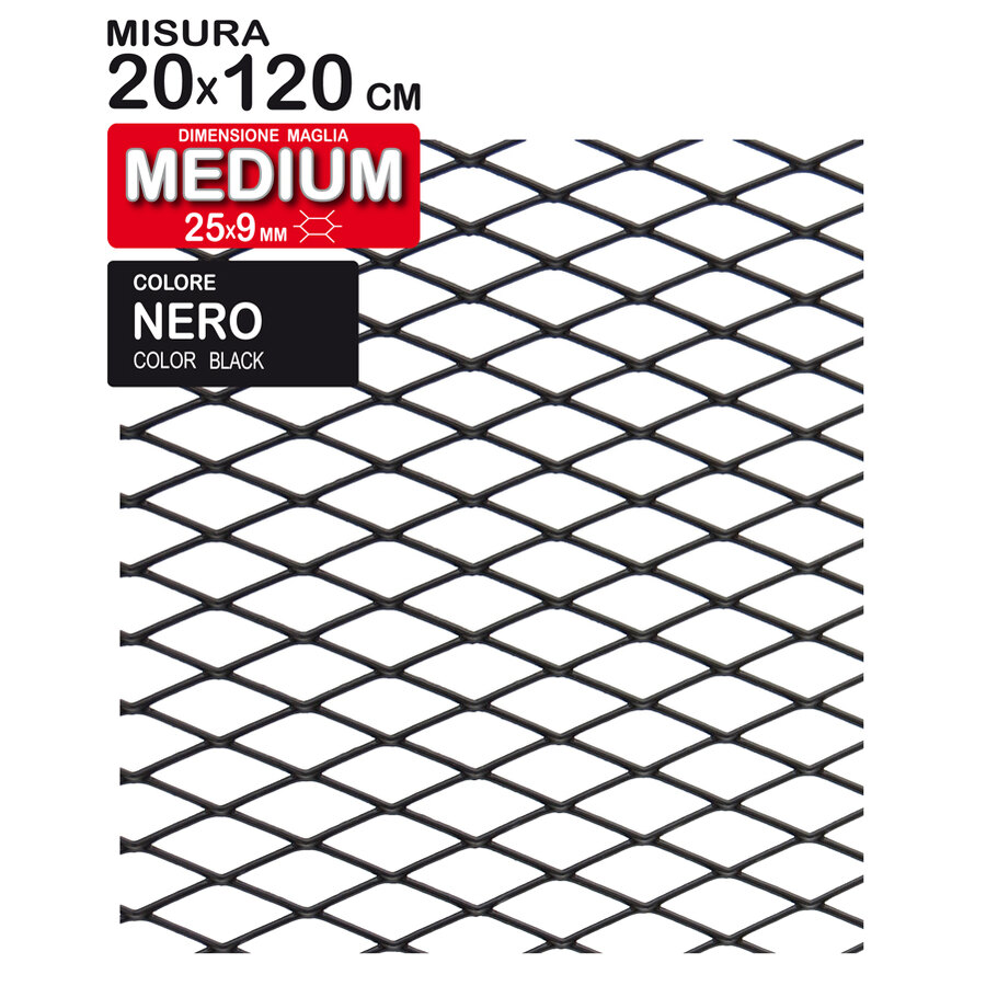 Griglia in alluminio colorato, maglia medium, larghezza maglia 25mm, altezza 9mm. Perfetta per paraurti, prese d'aria, calandre.. Alluminio anodizzato di alta qualità. Facile da ritagliare e modellare. Verniciabile con vernice spray, a spruzzo o a pennello