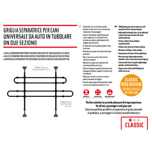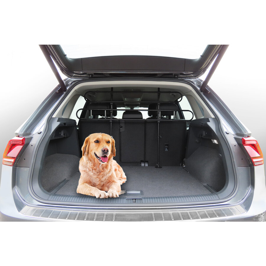 Griglia separatrice per cani universale da auto in tubolare (2 sezioni). Soluzione perfetta per offrire un'esperienza di viaggio piacevole al guidatore, ai passeggeri e al vostro animale domestico. Trasportate con cura il vostro animale domestico nella zona di carico, lontano dal conducente e dai passeggeri. Completamente regolabile in altezza e larghezza per adattarsi alla maggior parte dei SUV/Auto a due volumi/Van/Statio Wagon. Permette una visione chiara fuori dal lunotto posteriore. Montaggio ed installazione rapidi con tubi che si montano a pressione. Senza la necessità di praticare fori, buchi o utilizzare strumenti. Tamponi di protezione in gomma per proteggere il rivestimento, tappetini e prevenire gli scivolamenti. Realizzata con tubi in acciaio verniciato a polvere resistenti ma leggeri. Facile da riporre in quanto di piccole dimensioni e pieghevole quando non in uso