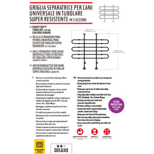 Griglia separatrice per cani universale da auto in tubolare super resistente in 3 sezioni. Soluzione perfetta per offrire un'esperienza di viaggio piacevole al guidatore, ai passeggeri e al vostro animale domestico. Barriera a tre sezioni forte e robusta per offrire un'extra protezione. Completamente regolabile in altezza e larghezza per adattarsi alla maggior parte dei SUV/Auto a due volumi/Van/Statio Wagon. Permette una visione chiara fuori dal lunotto posteriore. Montaggio ed installazione rapidi con tubi che si montano a pressione. Senza la necessità di praticare fori, buchi o utilizzare strumenti. Tamponi di protezione in gomma per proteggere il rivestimento, tappetini e prevenire gli scivolamenti. Realizzata con tubi in acciaio verniciato a polvere resistenti ma leggeri. Facile da riporre in quanto di piccole dimensioni e pieghevole quando non in uso