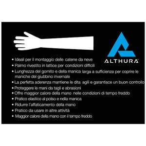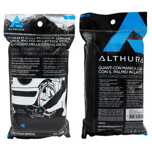Guanti con manica lunga e palmo in lattice per il montaggio delle catene. Ideali per il montaggio delle catene da neve. Palmo rivestito in lattice per condizioni difficili. Maggior calore della mano anche con le basse temperature. Con manica larga a sufficienza per coprire le maniche del giubbino invernale. La perfetta aderenza mantiene le dita agili e garantisce un buon controllo. Protegge le mani da tagli e abrasioni. Pratico elastico al polso e nella manica