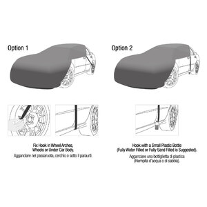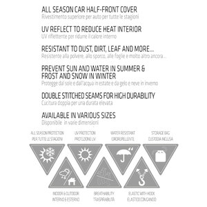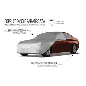 Copri cofano e parabrezza. La soluzione ideale per proteggere la tua auto in tutte le stagioni. Custodia inclusa. Elastico con gancio all'estremità. Protezione UV: per ridurre il calore interno. Idrorepellente (att.ne: l'auto si può bagnare se rimane esposta per un lungo periodo di tempo sotto la pioggia, nel bagnato o sulla neve). Traspirante. Resistente alla polvere, allo sporco, alle foglie e molto altro ancora. Protegge dal sole e dalla pioggia in estate e da gelo e neve in inverno. Cucitura doppia per una maggiore durata