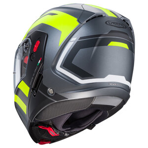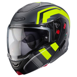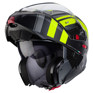 Calotta LG Chem Hi-Impact ABS. Doppia visiera: trasparente esterna, parasole fumè interna. Sganciamento rapido visiera. Visiera antigraffio con Pinlock Max Vision di serie. Visiera ampia per vista panoramica. Sistema di ritenzione: fibbia micrometrica. Interno estraibile e lavabile. Profili antipioggia. Stop-Wind amovibile. Presa d'aria regolabile sul mento. Grande presa d'aria superiore regolabile. Predisposto per l'uso con occhiali. Due estrattori d'aria posti sul retro. Peso 1650 gr. +/- 50 gr. Doppia omologazione P/J. ECE 22.06