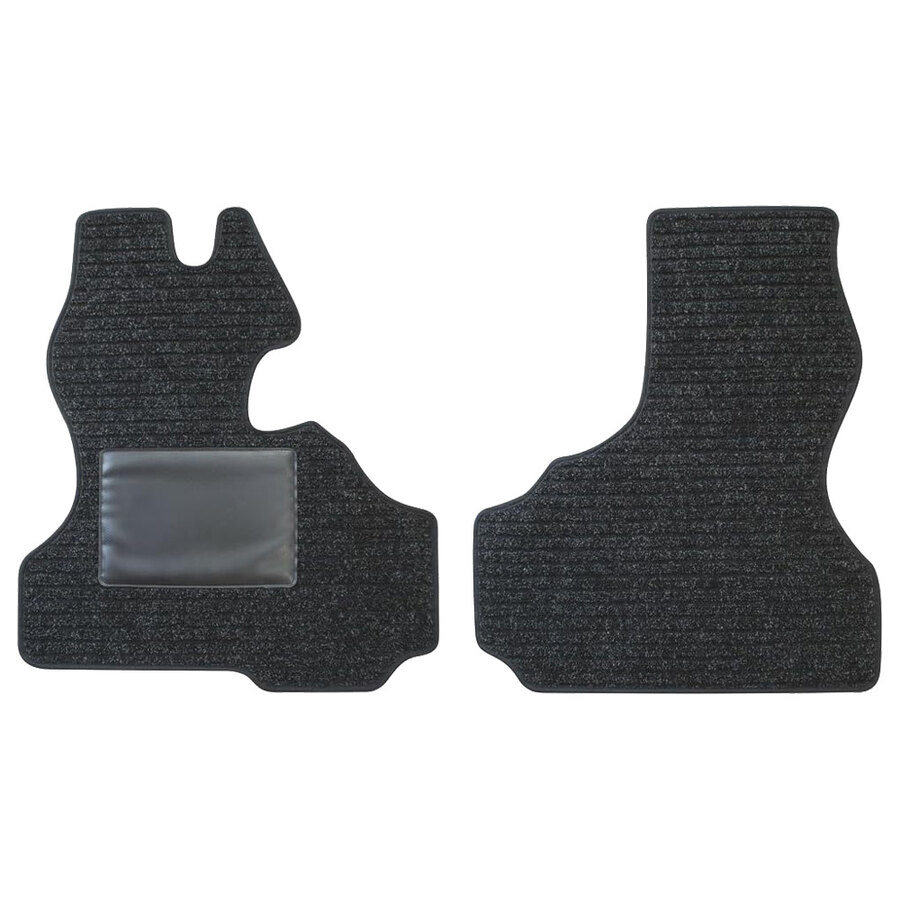 Coppia tappeti realizzati in resistente moquette particolarmente adatta all'impiego sui veicoli commerciali. Colore grigio a righe nere