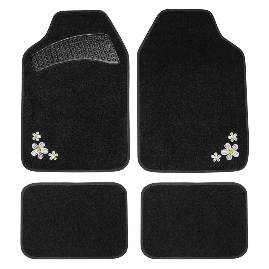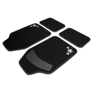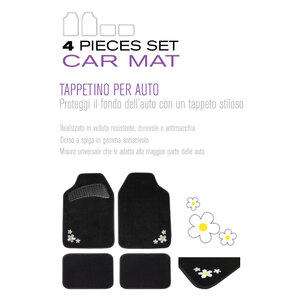 Proteggi la tua auto con un tappetino stiloso! Tappeti auto universali realizzati in velluto resistente, durevole e antimacchia. Dorso a spiga in gomma antiscivolo. Battitacco in gomma. Misura universale che si adatta alla maggior parte dei modelli di auto. Misure: tappeti anteriori 65x42,7cm, tappetini posteriori 28x41,5cm