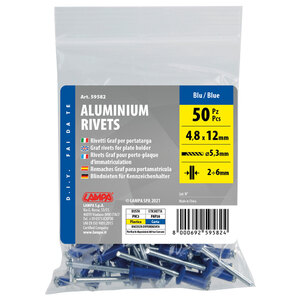 Set 50 rivetti Graf per portatarga. Rivetti in alluminio misura 4,8x12mm. Foro d'inserimento 5,3mm Spessore tenuta 2-6 mm