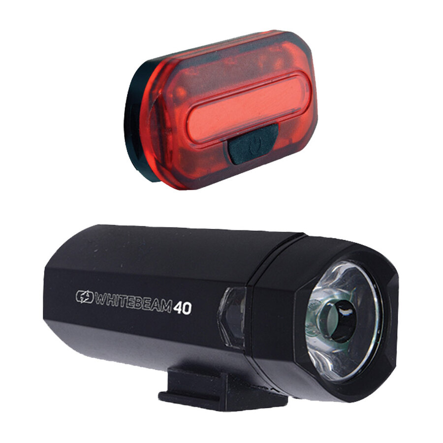 Set Bright Beam. kit luci a Led anteriore e posteriore. Anteriore: singolo LED ad alta potenza, visibilità a 270 gradi, cinghia per manubrio, batteria tipo 3xAAA (in dotazione). Posteriore: LED chip-on-board, cinturino reggisella in silicone, tipo di batteria 2xCR2032 (in dotazione). Modalità: costante (autonomia ca 40 ore), flash (autonomia ca 72 ore)