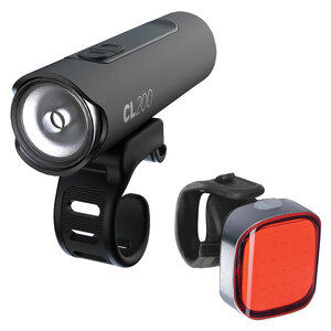 Faro anteriore: 5 leds, due modalità: costante e lampeggiante, 3 batterie AAA incluse, montaggio a manubrio. Faro posteriore: 3 led, due modalità: costante e lampeggiante, 2 batterie AAA incluse, fissaggio sul reggisella