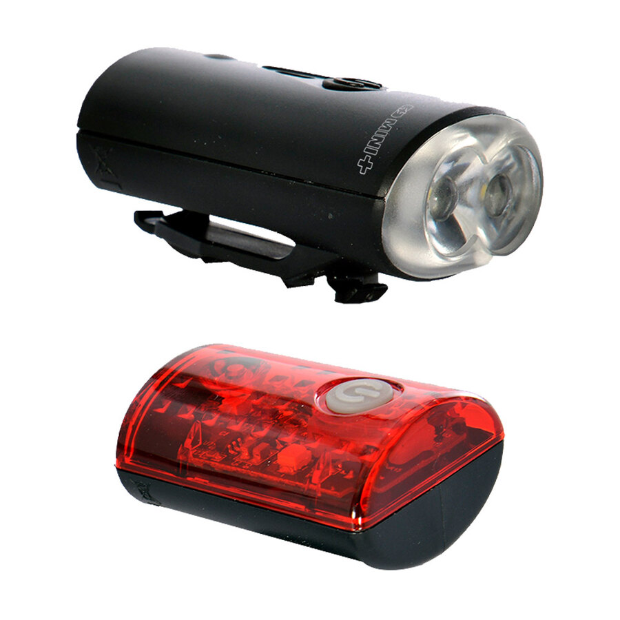 Mini Plus Set. Luce anteriore da 100 lumen e luce posteriore da 15 lumen. Impermeabile IP65. Batteria ricaricabile tramite USB 3,7v 220mAh Li-pol. Modalità test livello batteria (anteriore) e indicatore batteria scarica. Installazione rapida su manubrio e reggisella senza la necessità di ultilizzare altri attrezzi. Cavo micro USB e cinturino in gomma inclusi. Modalità: alta costante, media costante, bassa costante e flash