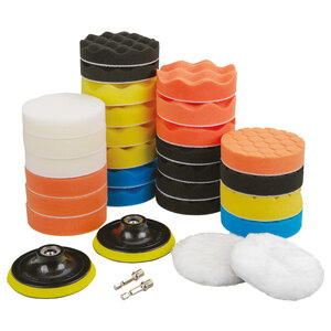 25 spugne di forme e consistenze diverse per ogni tipo di esigenza e di utilizzo. Per togliere i graffi, dare la cera e lucidare la carrozzeria dell'auto, camion, moto, etc. in modo uniforme e veloce. Ideali anche per ceramiche, plastiche, uso domestico e lavori fai-da-te. Possono essere utilizzati in combinazione con cere, creme e liquidi specifici per la cura dell?auto riducendone la quantità necessaria. Misura XL (diam. 10cm/4") per eseguire il lavoro in modo molto più rapido rispetto ai tamponi più piccoli. Leggeri e facili da montare e sostituire, grazie al retro in tessuto speciale che si aggrappa immediatamente al velcro del disco. Lavabili e riutilizzabili. La vite di collegamento in acciaio M10, è adatta per la maggioranza di trapani, avvitatori a batteria e lucidatrici (non inclusi)