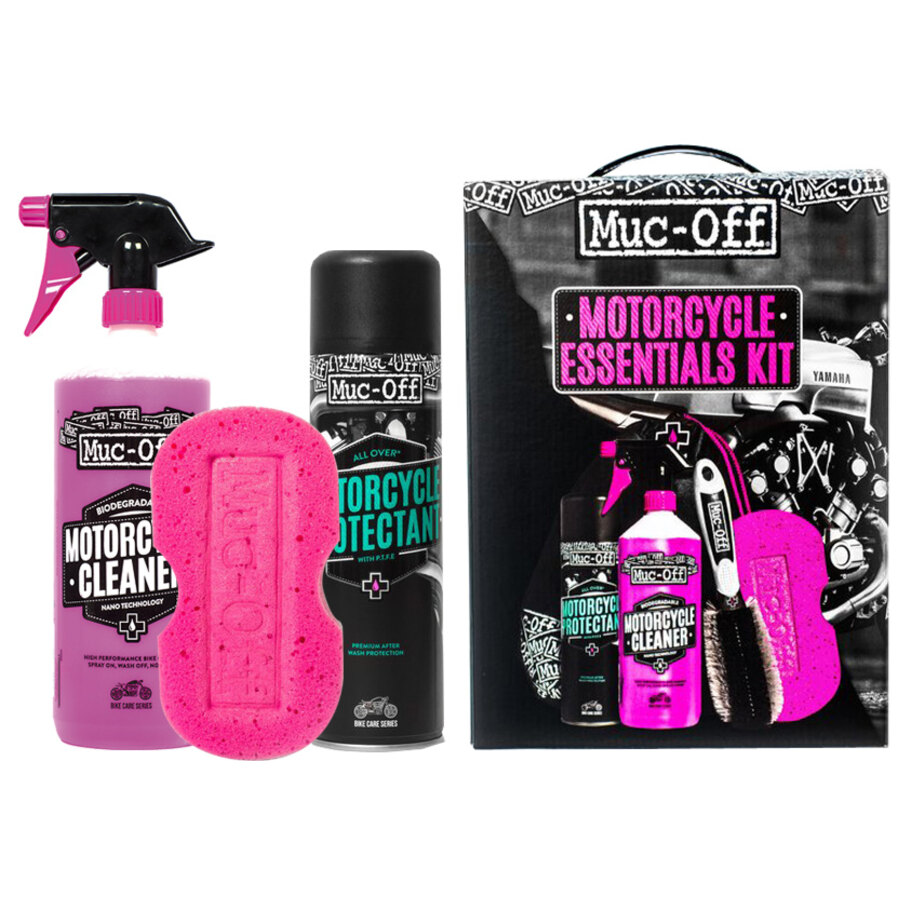 Il kit Essential Muc-Off include tutti i prodotti base necessari per la manutenzione ordinaria della moto. Il kit include i seguenti articoli. "Motorcycle Cleaner": pulitore multiuso, rimuove qualsiasi tipo di sporco grazie alla "nano-tech", può essere utilizzato su qualsiasi superficie, 100% biodegradabile, non contiene acidi o solventi. "Motorcycle Protectant": protettore moto ad alta concentrazione di P.T.F.E che impedisce l'adesione dello sporco, sviluppato in modo da poter essere utilizzato su tutte le parti della moto, contiene un inibitore di corrosione che elimina l'umidità del dopo lavaggio lasciando uno strato protettivo invisibile. "MicroCell Sponge": spugna ergonomica. "Spazzola cerchi": spazzola modellata e sagomata appositamente per pulire con facilità cerchi, raggi e freni, con setole in nylon durevoli ed impugnatura resistente
