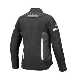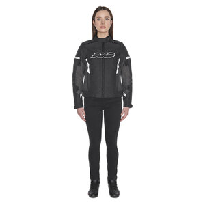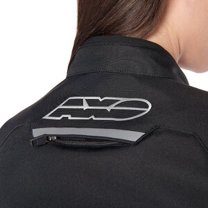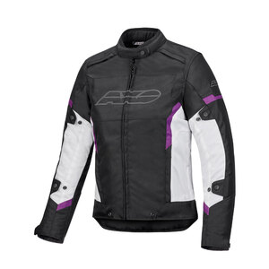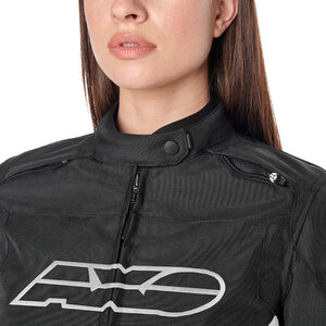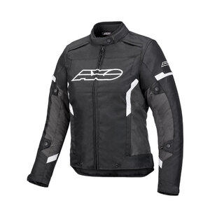 Giacca da donna in tessuto, quattro stagioni con membrana impermeabile ed interno removibile. Giacca esterna in tessuto armaturato con membrana interna termo nastrata, impermeabile e traspirante. Collo con margine in neoprene, interno in microfibra e chiusura frontale con bottone a pressione. Chiusura frontale con zip. 2 tasche al fondo con chiusura zip. Multi regolazioni su maniche, fondo e polsi. Aperture di ventilazione su spalle e schiena. Dettaglio riflettente su schiena. Interno foderato in tessuto traspirante. 2 tasche interne con velcro. Tasca interna impermeabile con zip. Zip di connessione su punto vita interno per collegare la giacca ai pantaloni della collezione AXO. Interno removibile in tessuto trapuntato. Tasca interna con bottone automatico. Certificato secondo normativa EN17092:2020 - Livello: Classe A. Protezioni EN1621-1 di Livello 1 Type A su spalle e gomiti. Predisposizione paraschiena EN1621-2 liv. 2 (paraschiena non incluso: M 1903889 adatto a tutte le taglie)