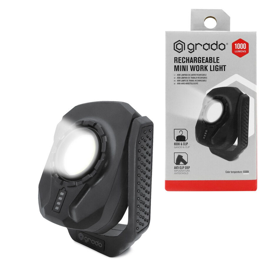 Mini lampada da lavoro ricaricabile. Impugnatura antiscivolo. Temperatura colore: 6500K. Gancio e clip incorporati per un facile fissaggio. Illuminazione a mani libere: ideale per le riparazioni in auto, il campeggio o in caso di emergenza. Illuminazione superiore grazie alla tecnologia Cob Led con modalità alta, media e bassa per una maggiore versatilità. IP X4. Materiale ABS. Batteria 1200mAh. Tempo di ricarica: 2 ore. Tempo di lavoro 4 ore. Cavo di ricarica USB Type C incluso