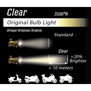 Lampadina progettata per scooter e moto. Filamento rinforzato anti-vibrazioni. Luce tipo originale, ma super luminosa! La linea Bryte CLEAR è la miglior soluzione per sostituire la lampadina originale con una lampada a più lunga durata. Luce più lumiosa del 20% rispetto ad una lampadina originale. Fascio di luce più profondo di circa 10mt rispetto alle lampadine originali. Omologazione E13, ECE R37