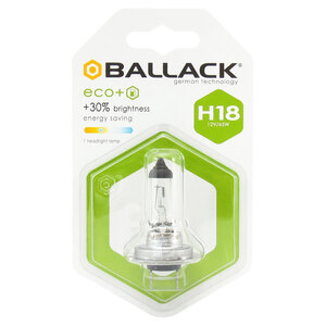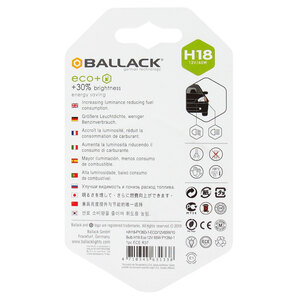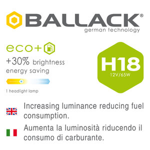 Lampadina a risparmio energetico a lunga durata. Minor consumo di carburante, minori emissioni di CO2, risparmio energetico, 30% di luce in più. La riduzione del consumo di energia dato da queste lampadine si traduce in un'ottimizzazione del consumo di carburante dell'auto. L'utilizzo di Ballack Eco consente un risparmio fino al 20% di energia per ogni set di lampade. Allo stesso tempo si fornisce il proprio contributo alla salvaguardia del pianeta attraverso la riduzione delle emissioni dannose CO2 nell'atmosfera. Omologazione E13 - ECE R37