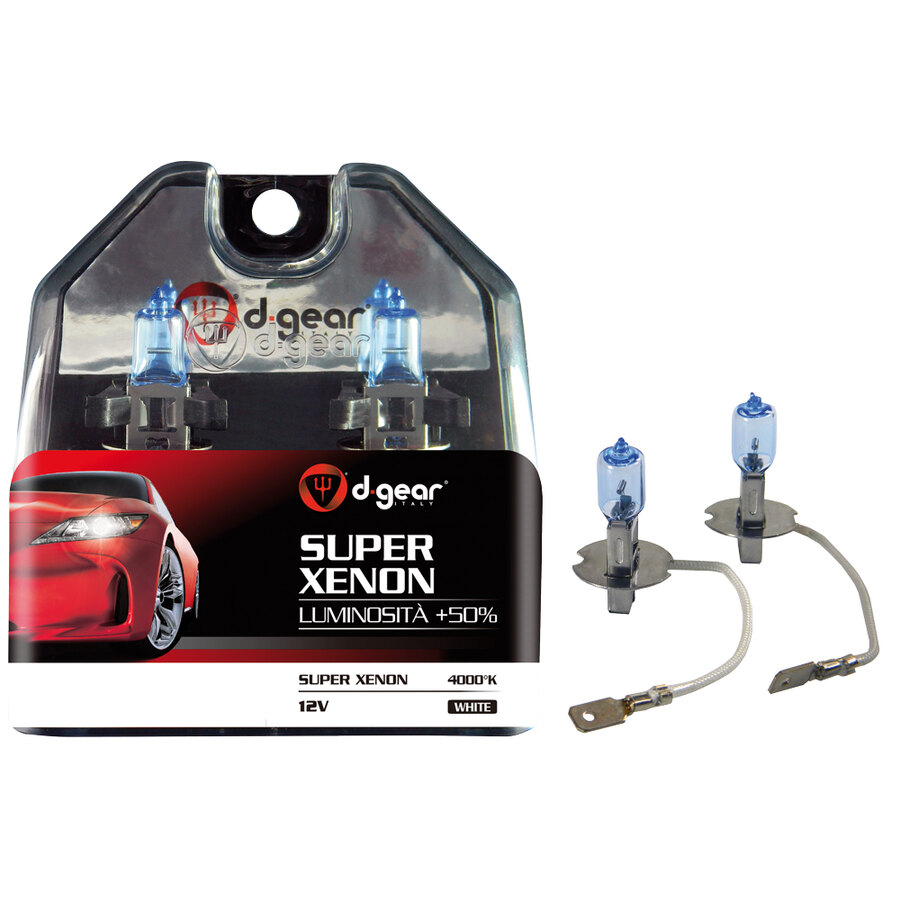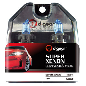 Il modello Super è il primo livello di lampadine D-gear con la nuova tecnologia Xenon. Emette luce bianca che raddoppia il grado di lucentezza rispetto alle tradizionali lampadine alogene, eliminando dai vostri fanali quel fastidioso color bianco-giallo originale, disponibili anche con una leggera frequenza azzurra. Le lampadine sono fornite in coppia e sono omologate E13 - ECE R37