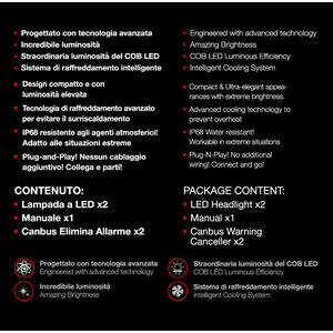 Led Headlight Conversion Kit Canbus Xenon white. Incredibile luminosità. Sistema di raffreddamento intelligente e compatto. Nuovo dissipatore di calore più veloce del 35%. che inoltre garantisce una prolungata durata di oltre 35,000 ore. Incredibile luminosità migliorata del 15%. Straordinaria luminosità del COB LED. Incredibile visibilità della strada. IP68 resistente agli agenti atmosferici: adatto alle situazioni estreme! Plug-and-Play: nessun cablaggio aggiuntivo, collega e parti! Questa lampadina a LED funziona con la maggior parte dei veicoli senza errori, tuttavia alcuni veicoli possono richiedere di installare il decoder o una resistenza per evitare l'errore di codifica o di lampeggiamento. Potenza 36W. Tensione di funzionamento 9V-32V. Kit compatibile anche con attacchi H8 e H9