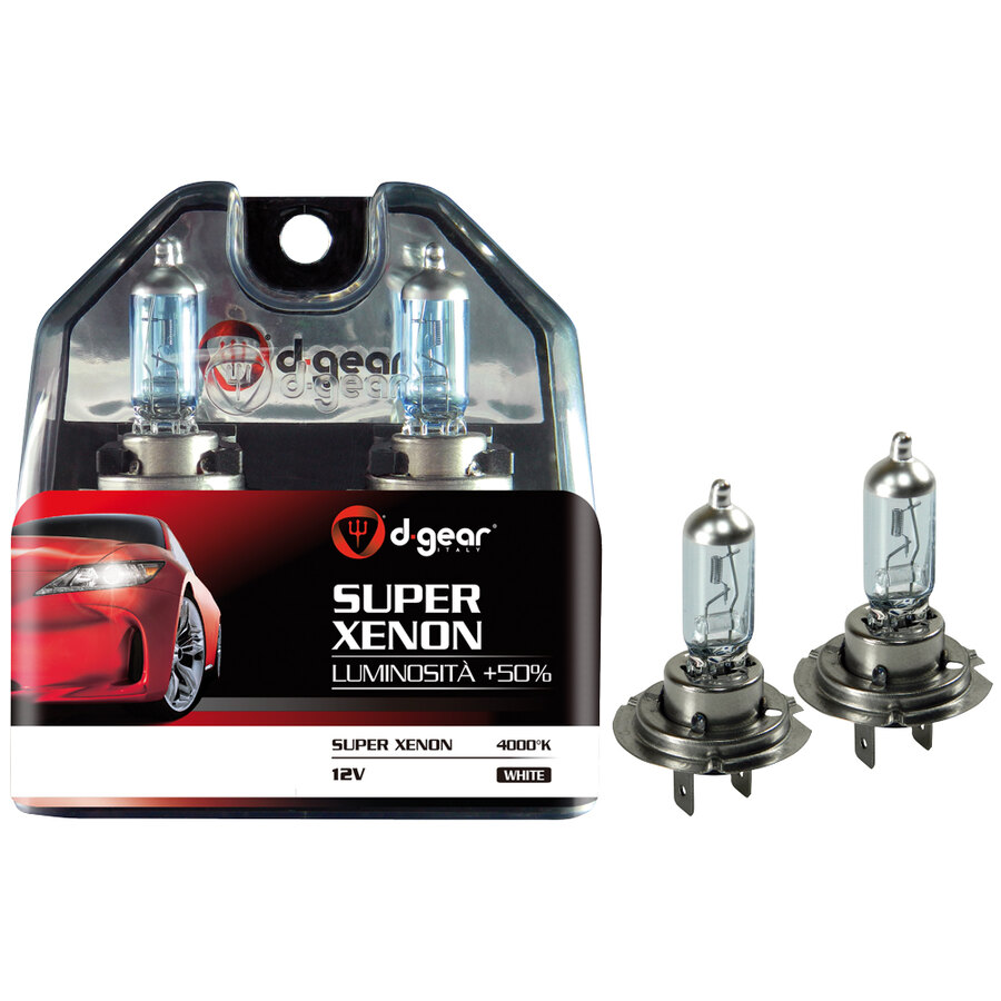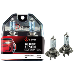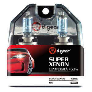 Il modello Super è il primo livello di lampadine D-gear con la nuova tecnologia Xenon. Emette luce bianca che raddoppia il grado di lucentezza rispetto alle tradizionali lampadine alogene, eliminando dai vostri fanali quel fastidioso color bianco-giallo originale, disponibili anche con una leggera frequenza azzurra. Le lampadine sono fornite in coppia e sono omologate E13 - ECE R37