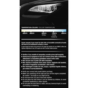 Aggiorna il colore giallo degli anelli con una luce bianca brillante. Lampadina Angel Eye. Luce 7000K colore bianco estremo. Sostituzione rapida, plug and play, nessuna modifica richiesta. Corpo in alluminio per raffreddare e dissipare il calore. Nessun lampeggio o effetto strobo. Basso consumo di potenza e quindi risparmio in termini di energia