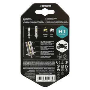 Lampadina di dimensioni simili alle lampadine alogene originali. Il chip LED di alta qualità offre una maggiore efficienza luminosa. +200% di luminosità. Progettata senza ventola. Canbus integrato. Nessuna modifica o cablaggio aggiuntivo necessario. In alcuni veicoli che hanno il computer di bordo (OBC) potrebbe essere necessario aggiungere una coppia di resistenze di carico al fine di evitare il messaggio di errore visualizzato sul cruscotto. Se la luce non funziona dopo l'installazione, è sufficiente invertire il terminale. Sistema di controllo della temperatura intelligente integrato. Piastra in rame a conduzione termica per una migliore dissipazione del calore. Corpo unico in alluminio