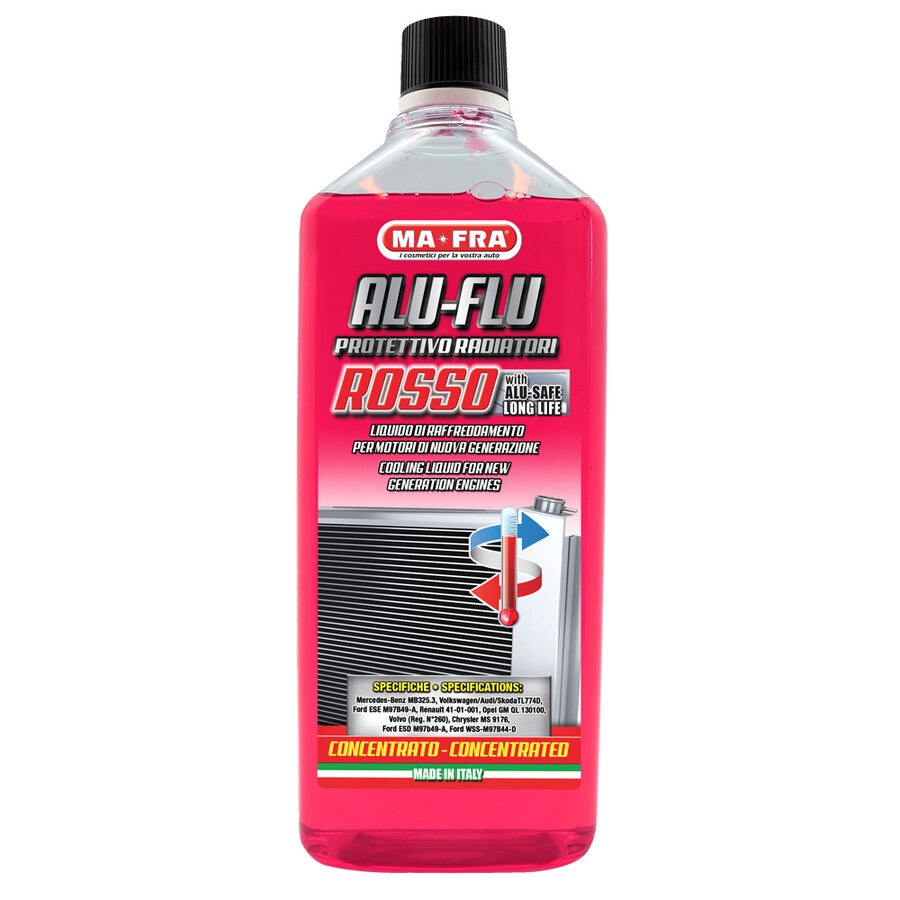 Protettivo radiatori rosso -38°C con Alu Safe Long Life. Liquido di raffreddamento per motori di nuova generazione. Concentrato. Specifiche: Mercedes Benz MB325.3, Volkswagen/Audi/Skoda TL774D, Ford ESE M97B49-A, Renault 41-01-001, Opel GM QL 130100, Volvo (reg n°260), Chrysler MS 9176, Ford ESD M97b49-A, Ford WSS-M97B44-D