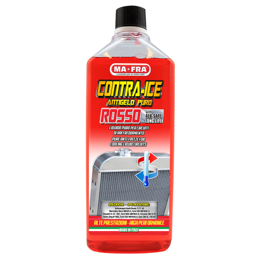 Antigelo puro per circuiti di raffreddamento. Prodotto di nuova concezione che contiene speciali inibitori per preservare leghe e alluminio. Contra Ice non crea depositi e incrostazioni, è privo di nitriti ed ammine ed è additivato con anticalcare. Specifiche: Volkswagen/Audi/Skoda TL77 4D, Mercedes Benz MB325.3, Ford ESE M97B49-A, Renault 41-01 -001, Ford WSS-M97B44-D, Chrysler MS 9176, Volvo (Reg. N°260), Ford ESD M97b49-A, Opel GM QL 130100