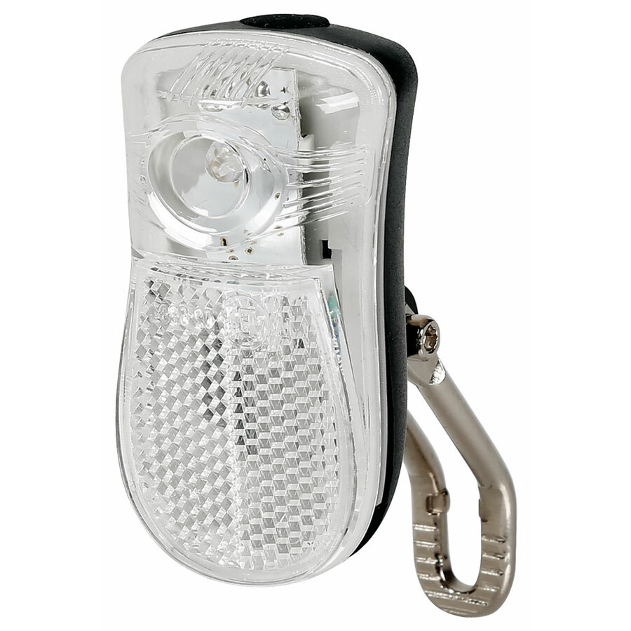 Fanale anteriore a led con catarifrangente. Led a 2 funzioni: luce fissa e lampeggiante. Con staffa per attacco forcella. Catarifrangente omologato. Universale, di facile installazione. Funziona con 2 pile AAA (non fornite). Omologato