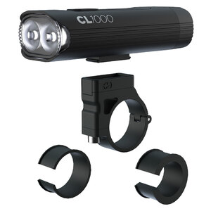 Luce anteriore ricaricabile tramite USB, potenza massima 1000 lumen. Indicatore di autonomia LCD. Staffa per manubrio progettata per un fissaggio semplice e sicuro alla bicicletta. Durata 1-80 ore (dipende della modalità luce selezionata). Uscita power bank USB. Visibilità a 270 gradi. 2 batterie al litio ricaricabili tramite USB da 3,7 V/2400 mAh. Impermeabile IPX4. Corpo in lega estrusa. Staffa per manubrio CLIQR Mini 31,8 mm. Cavo di ricarica USB in dotazione