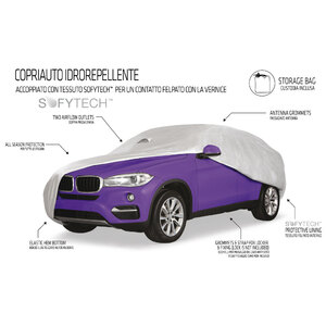 Copriauto realizzato internamente in tessuto Sofytech a 2 strati, antigraffio, per garantire un contatto "felpato" con la vernice e minori rischi di graffiare la carrozzeria. Ideale per tutte le stagioni. Progettato per uso da interno ed esterno. Traspirante, garantisce una migliore irradiazione di calore rispetto ad altri prodotti della stessa categoria. Protezione UV. Bordo elasticizzato per facilitarne l'installazione. Dotato di occhielli inferiori per fissaggio con cavo antifurto (cavo non incluso in confezione). Doppia presa d'aria. Cinghie e fibbie a prova di vento. Con speciale cerniera laterale per un facile accesso alla porta lato guida. Passacavo antenna. Custodia inclusa per riporlo quando non in uso. In tessuto idrorepellente (att.ne: l'auto si può bagnare se rimane esposta per un lungo periodo di tempo sotto la pioggia, nel bagnato o sulla neve)