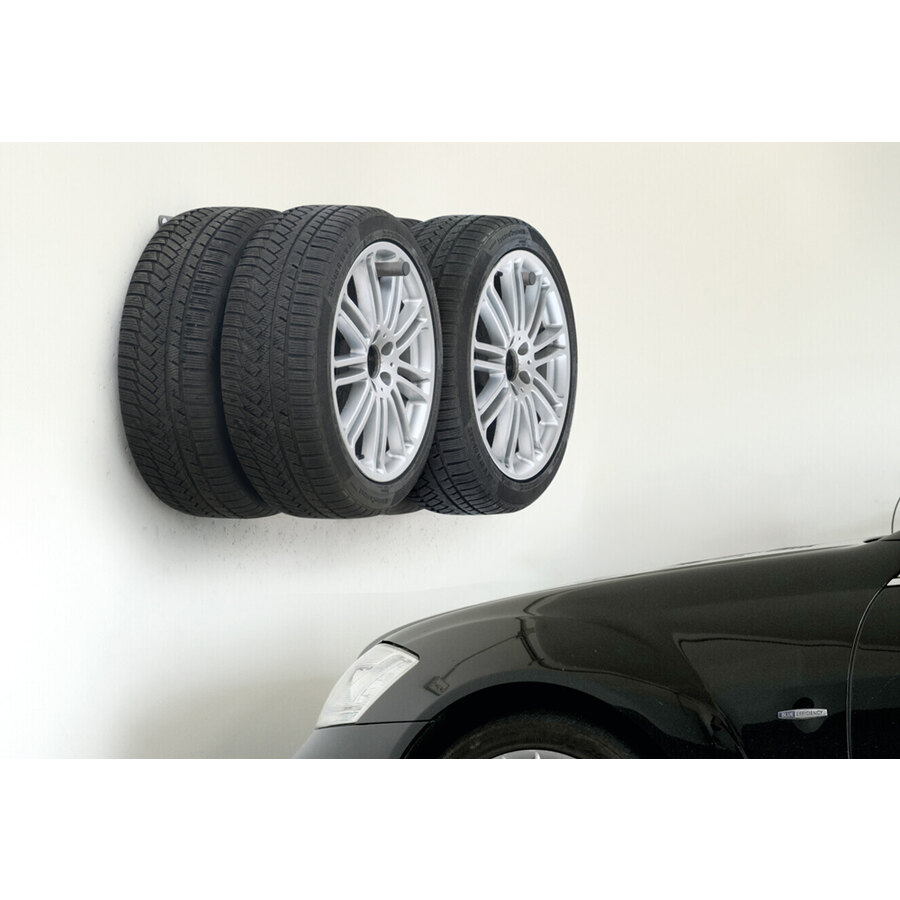 Set 2 ganci porta gomme e cerchioni da parete richiudibili. Ideali per il deposito di pneumatici + cerchioni, soli pneumatici o soli cerchioni. Design salvaspazio, ripiegabile per un minor ingombro quando non in uso. Facile da installare, comprende kit di fissaggio a parete fai da te (6 viti e 6 tasselli per cemento armato). In acciaio con verniciatura a polvere, antigraffio e anticorrosione. Struttura tubolare tonda (diam. 3,2cm), delicata sui cerchioni. Portata massima: 60 kg per gancio