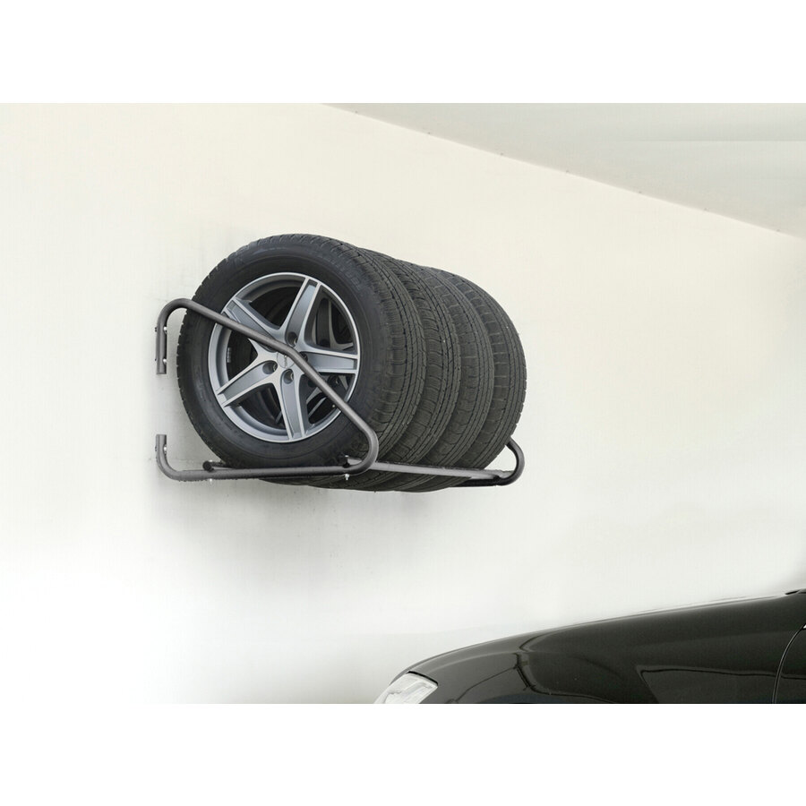 Supporto porta gomme e cerchioni da parete. Ideale per il deposito di pneumatici + cerchioni, soli pneumatici o soli cerchioni. Facile da installare, compreso di kit di fissaggio a parete fai da te (6 viti e 6 tasselli per cemento armato). Compatibile per pneumatici da diam. min 530mm a diam. max 765mm. Larghezza massima battistrada 300mm. In acciaio con verniciatura a polvere, antigraffio e anticorrosione. Struttura tubolare tonda (diam. 3,2cm), delicata sui cerchioni e previene la deformazione dei battistrada