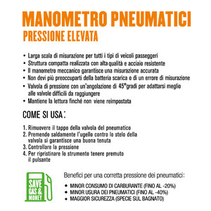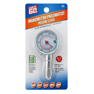 Manometro pneumatici. Pressione Elevata 0.7- 7 BAR. Larga scala di misurazione per tutti i tipi di veicoli. Struttura compatta realizzata con alta qualità e acciaio resistente. Garantisce una misurazione accurata. Non devi più preoccuparti della batteria scarica o di un errore di misurazione. Valvola di pressione con un'angolazione di 45° gradi per adattarsi meglio alle valvole difficili da raggiungere. Mantiene la lettura finchè non viene reimpostata. Benefici di una corretta pressione dei pneumatici: minor consumo di carburante, minor usura dei pneumatici, maggior sicurezza! Unità di misura: BAR, PSi