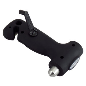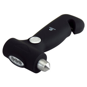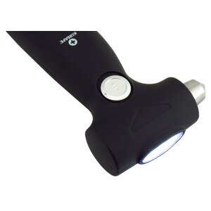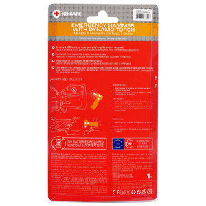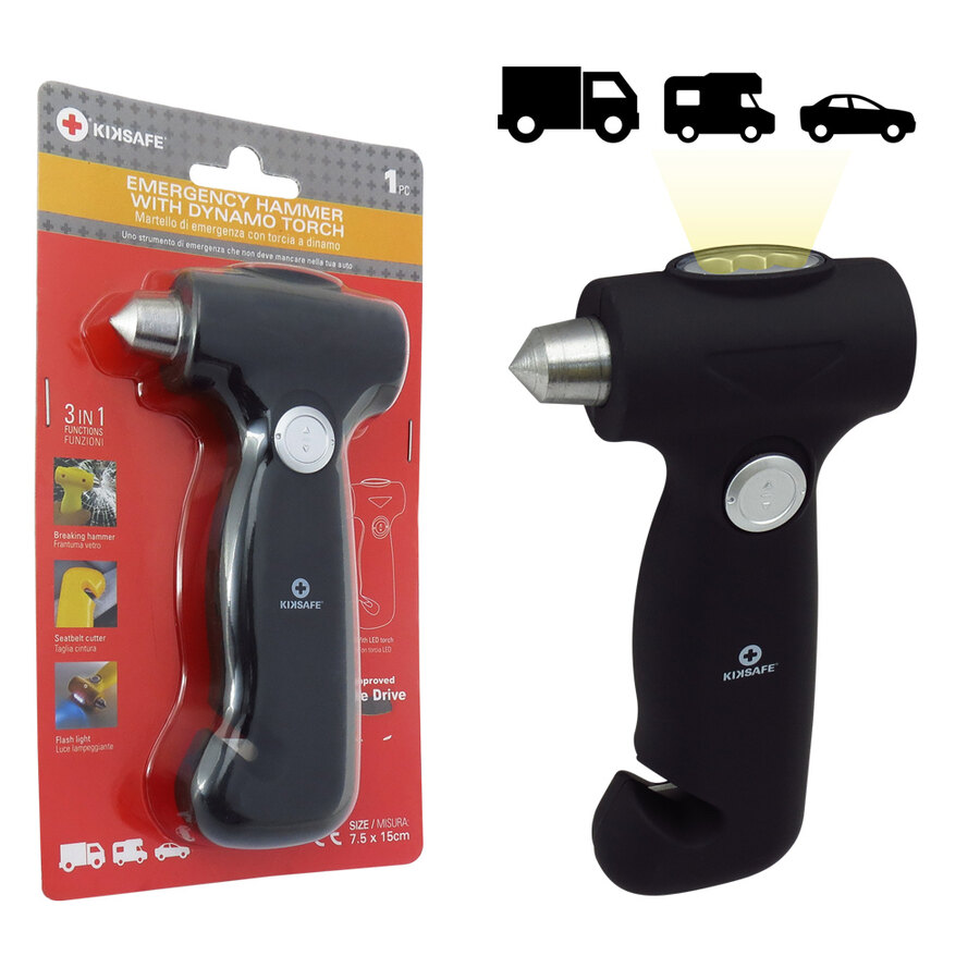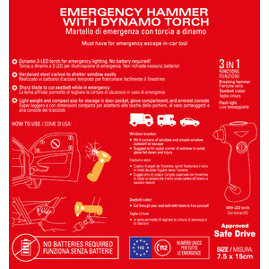 Martello di emergenza con torcia a dinamo. Torcia a dinamo a 3 LED per illuminazione di emergenza. Non richiede nessuna batteria. Realizzato in carbonio d'acciaio temprato per frantumare facilmente il finestrino. La lama affilata permette di tagliare la cintura di sicurezza in caso di emergenza. Super leggero e con dimensioni compatte per adattarsi alle tasche delle portiere, al vano portaoggetti e alla console del bracciolo