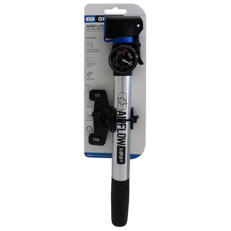 Minipompa con manometro. La doppia testina si adatta sia alle valvole Presta che Schrader. Maniglia pieghevole. Staffa di montaggio universale inclusa