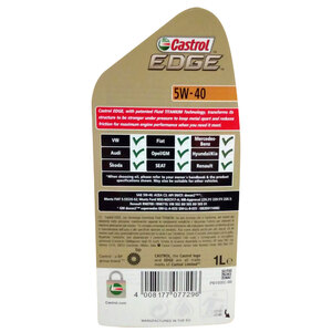 Castrol EDGE 5W-40 è un lubrificante completamente sintetico raccomandato per l'impiego nei motori a benzina e diesel nei casi in cui il produttore raccomandi lubrificanti conspecifiche ACEA C3 e API SN o precedenti: XXX. Caratteristiche: si trasforma per essere più resistente quando la pressione è elevata, proteggendo il motore; riduce l'attrito a qualsiasi regime e in ogni condizione di utilizzo del motore; testato in laboratori indipendenti secondo gli standard più elevati per dimostrarne le prestazioni; consigliato dalle case automobilistiche leader a livello mondiale; protegge il motore durante l'intero intervallo di cambio, anche con pressioni estreme. Specifiche: API SN/CF, ACEA C3, MB 229.31/229.51/226.5, VW 502 00/505 00/505 01, Ford WSS-M2C917-A, RN0700/RN0710, FIAT 9.55535-S2