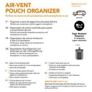Organizer a tasca da agganciare alla presa d'aria dell'auto. Perfetto per riporre piccoli oggetti o smartphone. In neopreme, super resistente. Facile da fissare. Tasca a rete supplementare per ulteriore spazio di conservazione. Ultra morbido e durevole