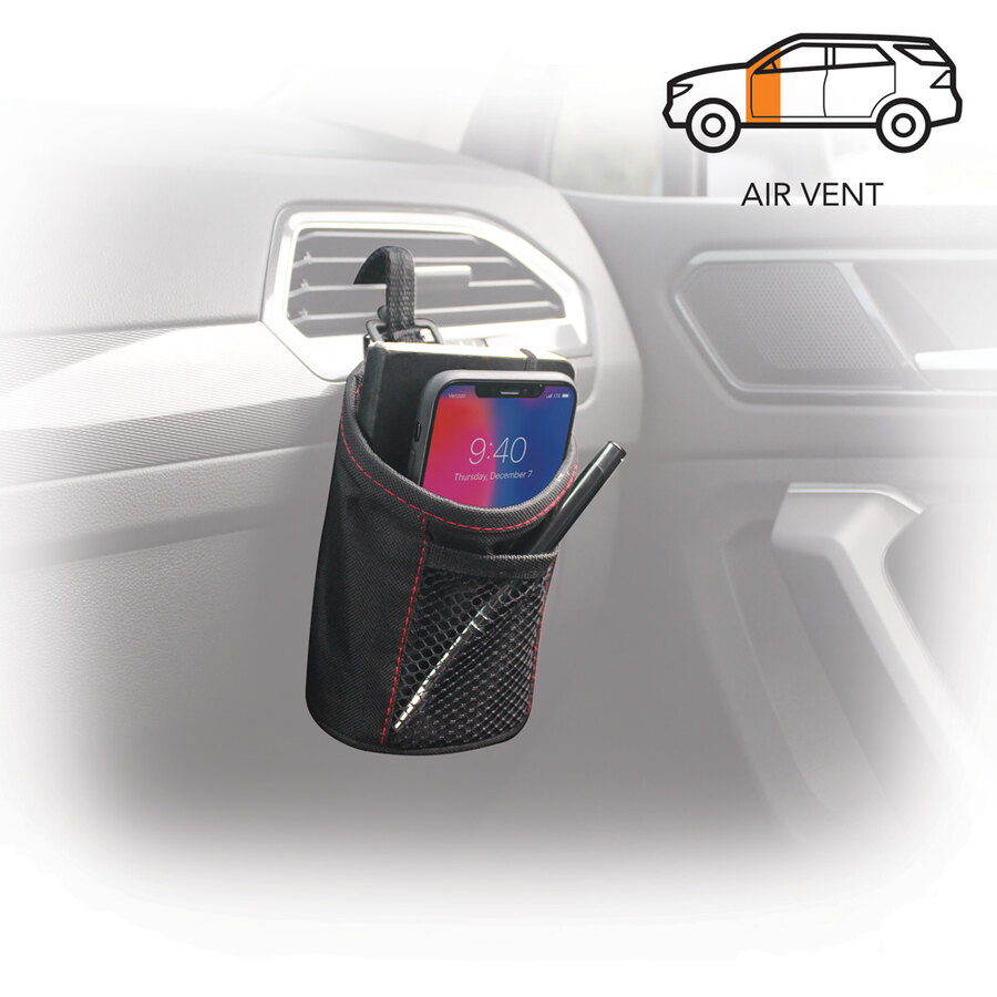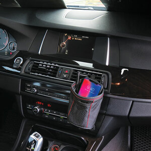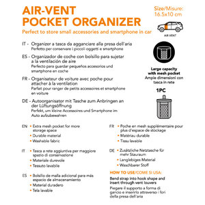 Organizer a tasca da agganciare alla presa d'aria dell'auto. Perfetto per riporre piccoli oggetti o smartphone. Ampie dimensioni con tasca in rete. Tasca a rete aggiuntiva per maggiore spazio di conservazione. Materiale durevole. Tessuto lavabile